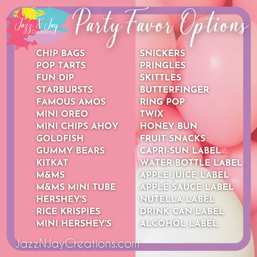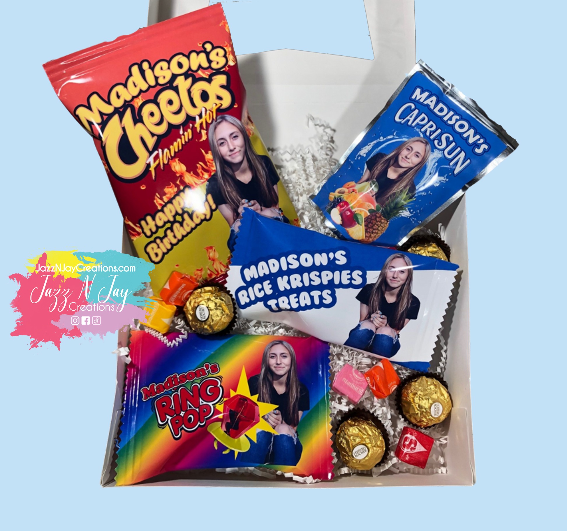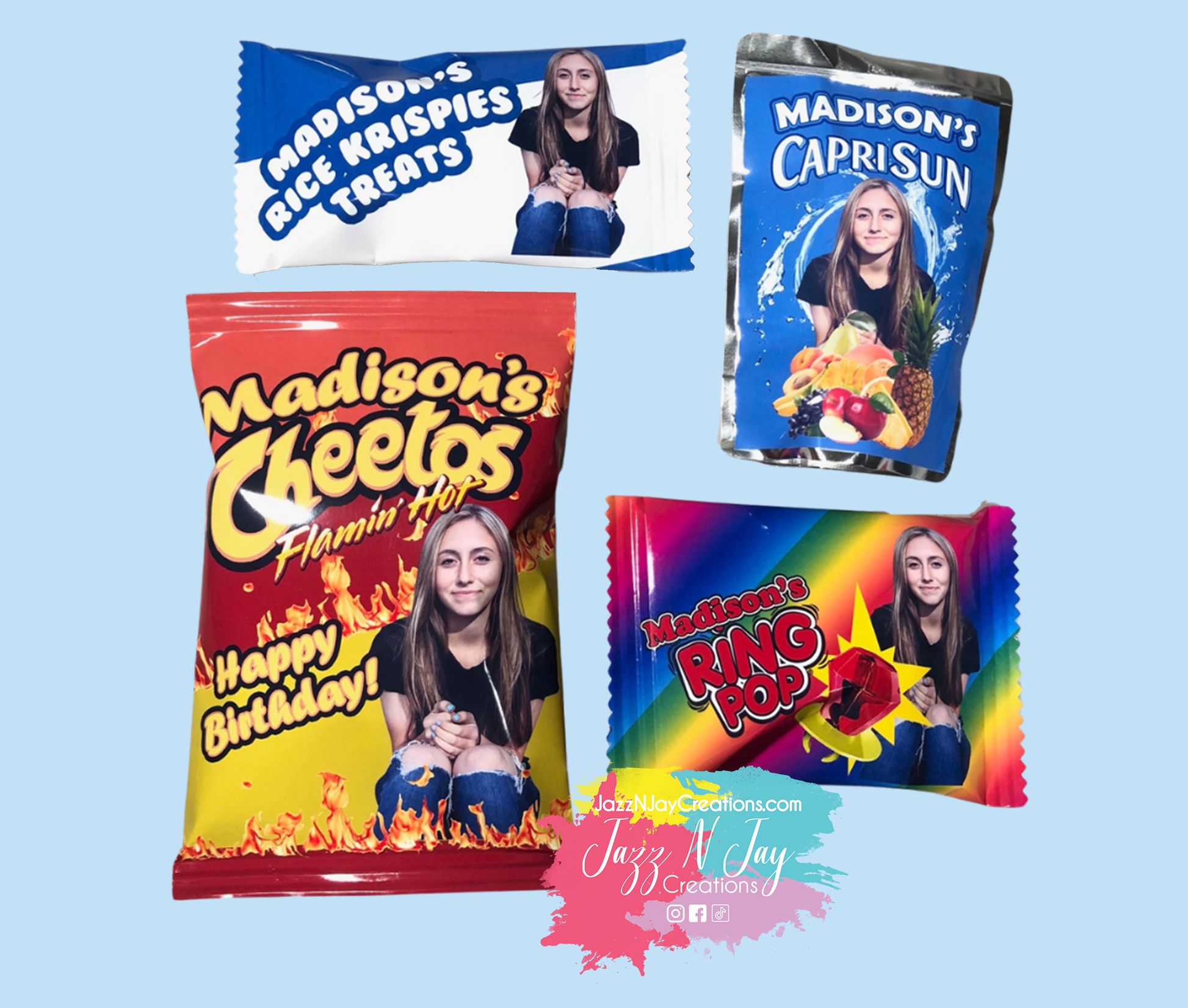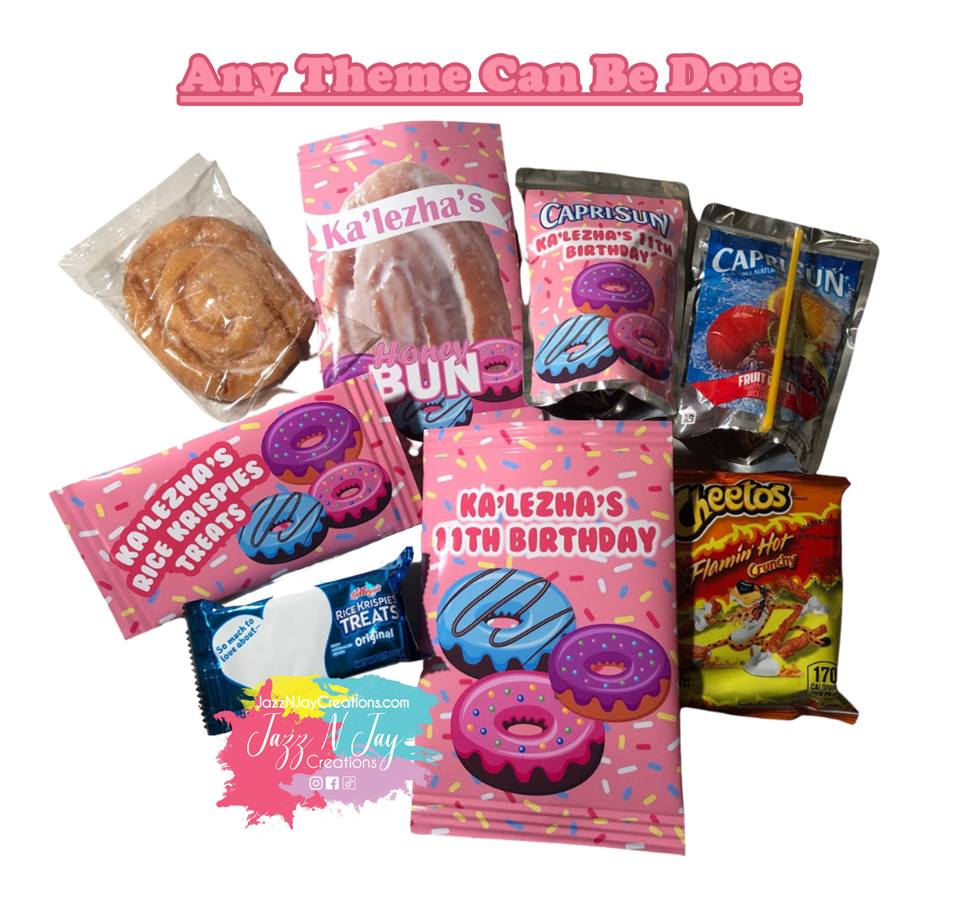 The wrappers can be customized to look like the original snack wrapper or any theme you would like. Please select the snacks you would like from the options in the gallery.