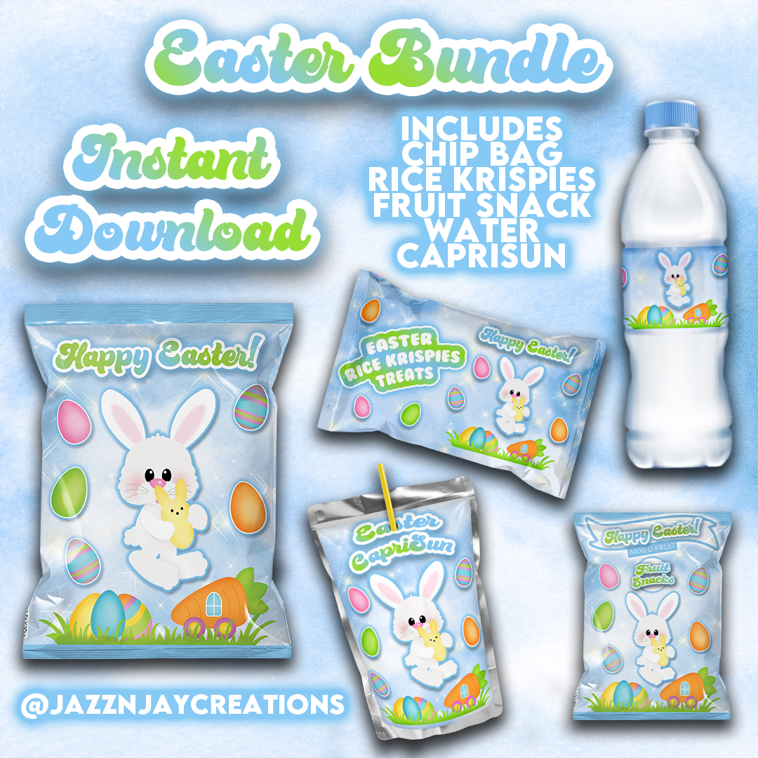 This listing is for a digital file Easter Party favor bundle, no physical item will be shipped. You will receive an instant download for Chip bag, Fruit snacks, Rice Krispies Treats, water bottle and caprisun