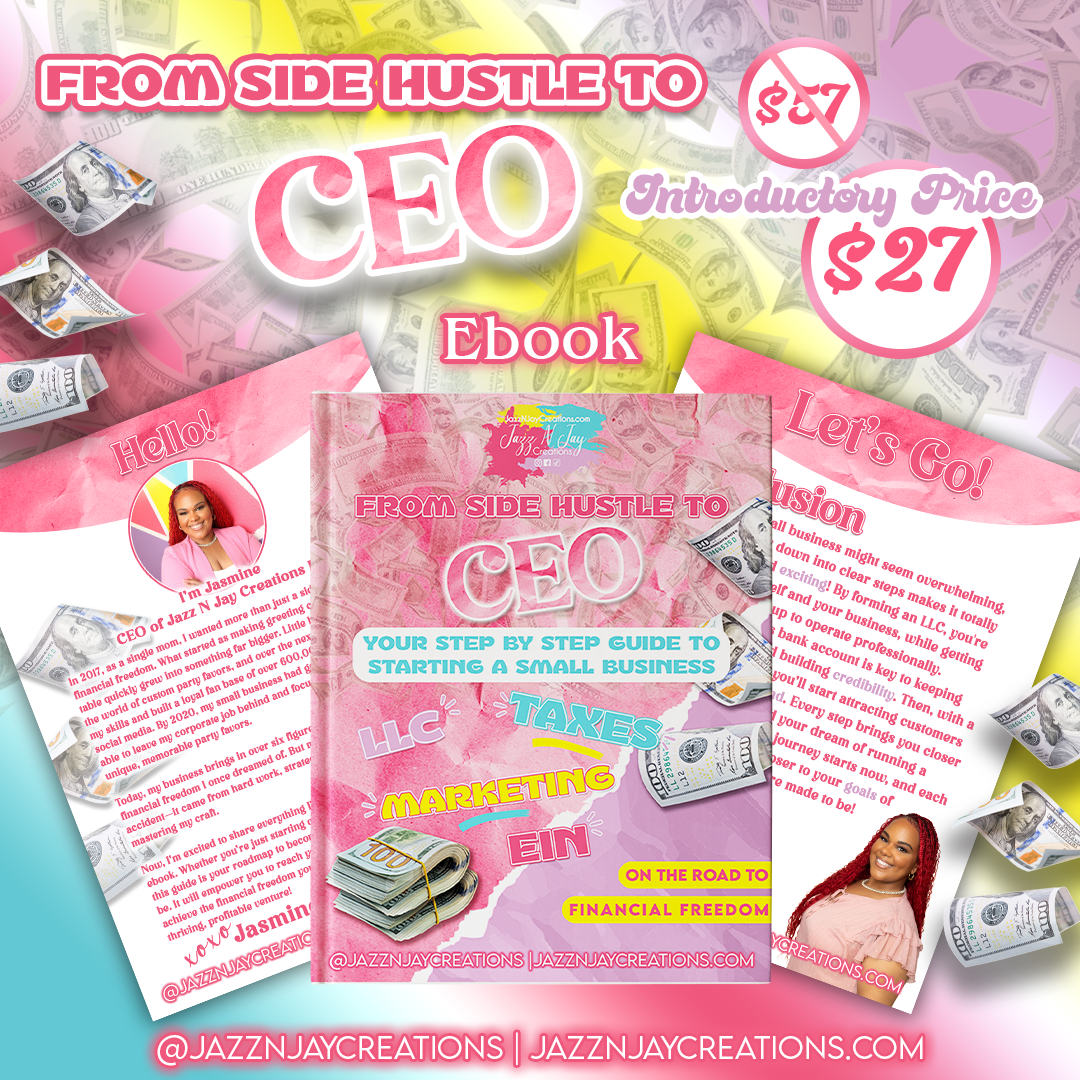 Are you ready to turn your side hustle into a thriving business and make your goals of financial freedom a reality? From Side Hustle to CEO is here to give you the confidence, tools, and steps needed to make that dream come true! Whether you’re just starting out or already running a small business, this eBook is packed with insights and clear, actionable advice to elevate your hustle to CEO status.