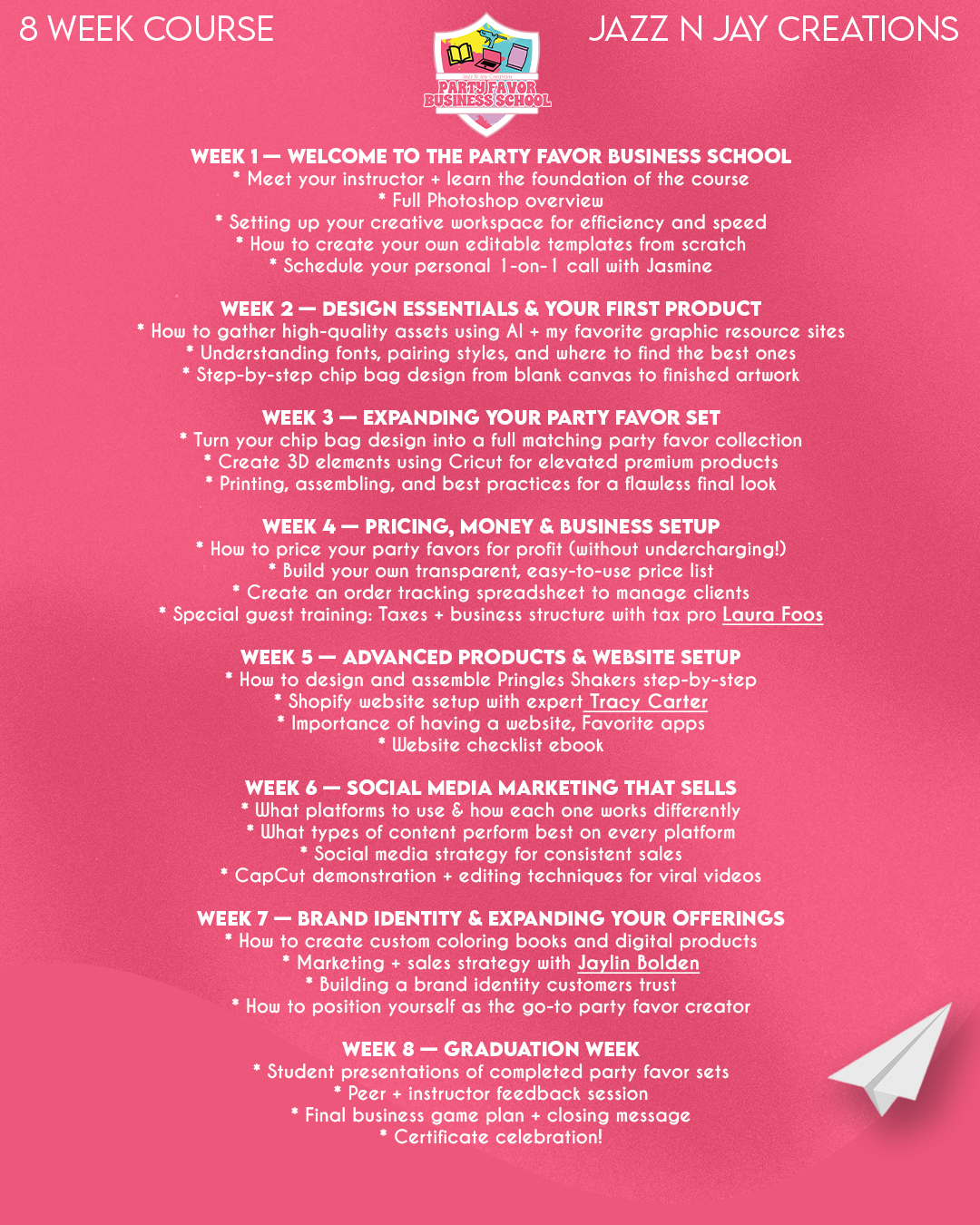 Party Favor Business School is an 8-week step-by-step business accelerator where you’ll learn everything from design to delivery, pricing to profit, and content to conversions.